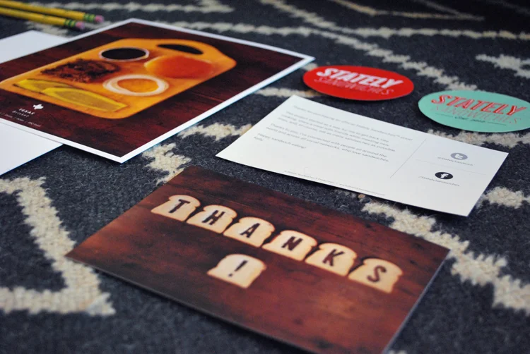 Customers receive a personal thank you note and Stately Sandwiches stickers with their print. The date stamp reminds customers of the story behind the sandwich and continues the deli experience.